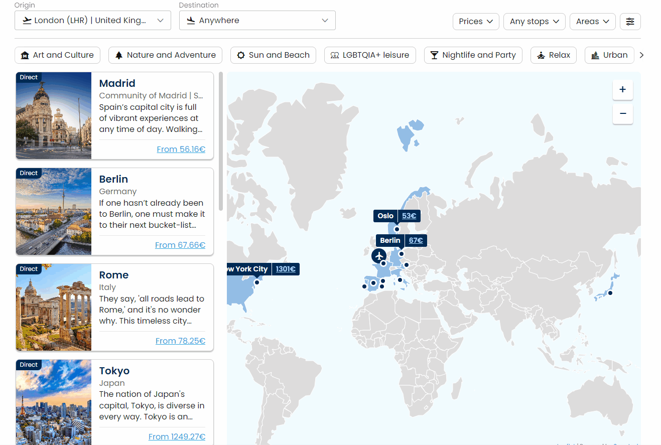 Uno de los aspectos más innovadores de Explore&Go es la capacidad de incorporar información de precios en tiempo real dentro del mapa interactivo. Esta característica aumenta la transparencia para el usuario y facilita el proceso de decisión de compra al proporcionar toda la información necesaria de manera clara y accesible. Tus clientes pueden ver los costos asociados con sus opciones de viaje directamente en la herramienta, lo que les permite hacer comparaciones y tomar decisiones informadas al instante.