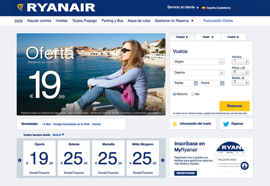 The first impression when landing on Ryanair’s site is crystal clear: this is a place to book, not to dream. The search engine dominates the screen, with no distractions. The corporate colors—yellow and blue—reinforce calls to action and create a recognizable look, although not one that’s particularly refined from a visual design perspective.